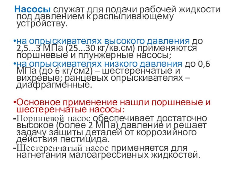 Слайд 9Насосы служат для подачи рабочей жидкости под давлением к распыливающему