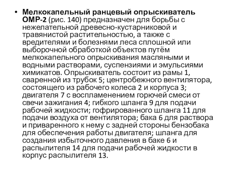 Слайд 20Мелкокапельный ранцевый опрыскиватель ОМР-2 (рис. 140) предназначен для борьбы с нежелательной
