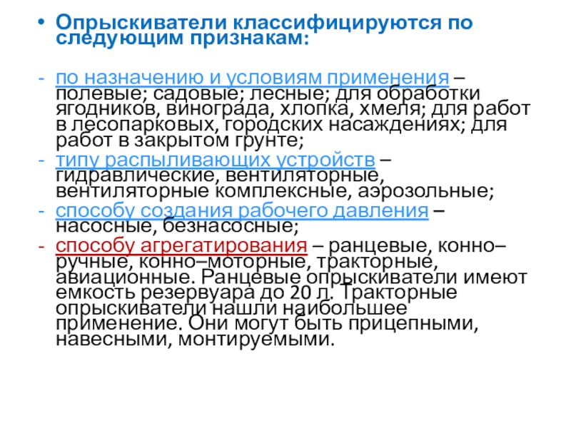 Слайд 6Опрыскиватели классифицируются по следующим признакам: