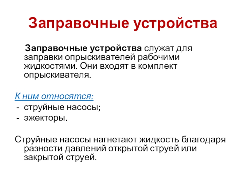 Заправка опрыскивателя производится через горловину бака с помощью заправочных средств. При самозаправке вся рабочая жидкость, кроме идущей на мешалку, подаётся насосом к переключателю пульта управления 13 «работа», «заправка», где создаётся разрежение за счёт высокой скорости истечения струи жидкости. Из водоёма или ёмкости жидкость засасывается по заправочному рукаву 12 в бак.