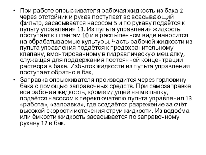 по рукаву подаётся к пульту управления 13. Из пульта управления жидкость поступает к штангам 10 и в распылённом виде наносится на обрабатываемые культуры. Часть рабочей жидкости из пульта управления подаётся к предохранительному клапану, вмонтированному в гидравлическую мешалку, служащая для поддержания постоянной концентрации раствора в баке. Избыток жидкости из пульта управления поступает обратно в бак.