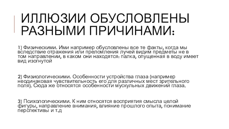 2) Физиологическими. Особенности устройства глаза (например неодинаковая чувствительность его для различных мест зрительного поля). Сюда же относятся особенности мускульных движений глаза.