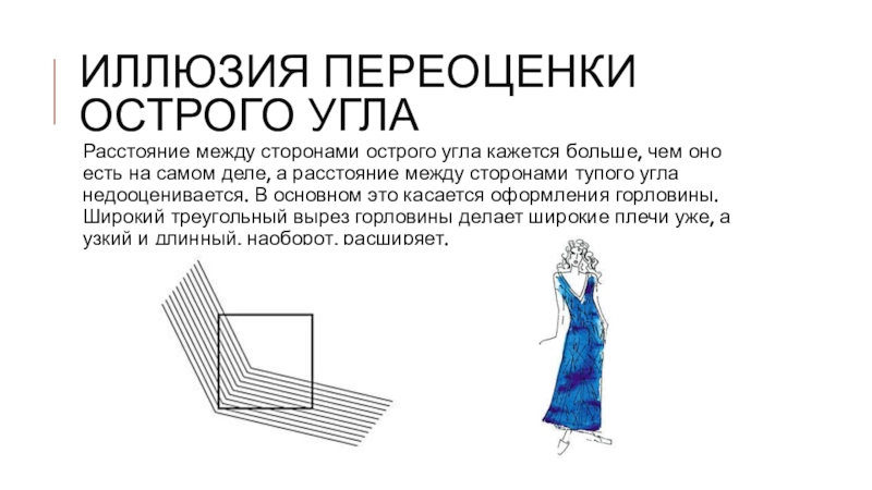 тупого угла недооценивается. В основном это касается оформления горловины. Широкий треугольный вырез горловины делает широкие плечи уже, а узкий и длинный, наоборот, расширяет.