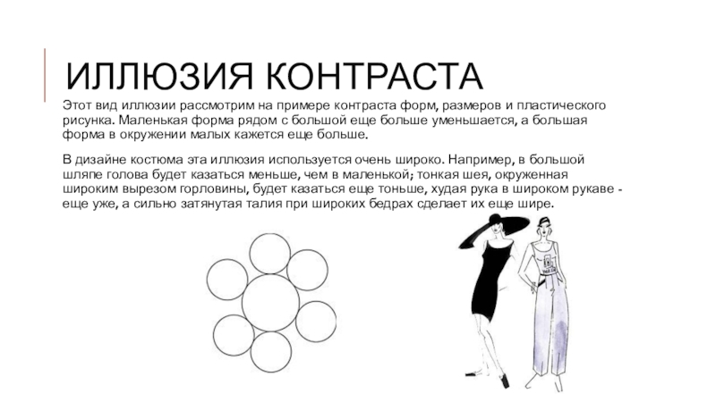 В дизайне костюма эта иллюзия используется очень широко. Например, в большой шляпе голова будет казаться меньше, чем в маленькой; тонкая шея, окруженная широким вырезом горловины, будет казаться еще тоньше, худая рука в широком рукаве - еще уже, а сильно затянутая талия при широких бедрах сделает их еще шире.