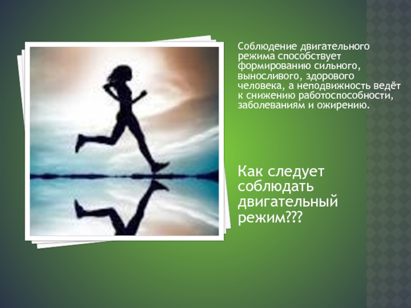 Слайд 3Соблюдение двигательного режима способствует формированию сильного, выносливого, здорового человека, а