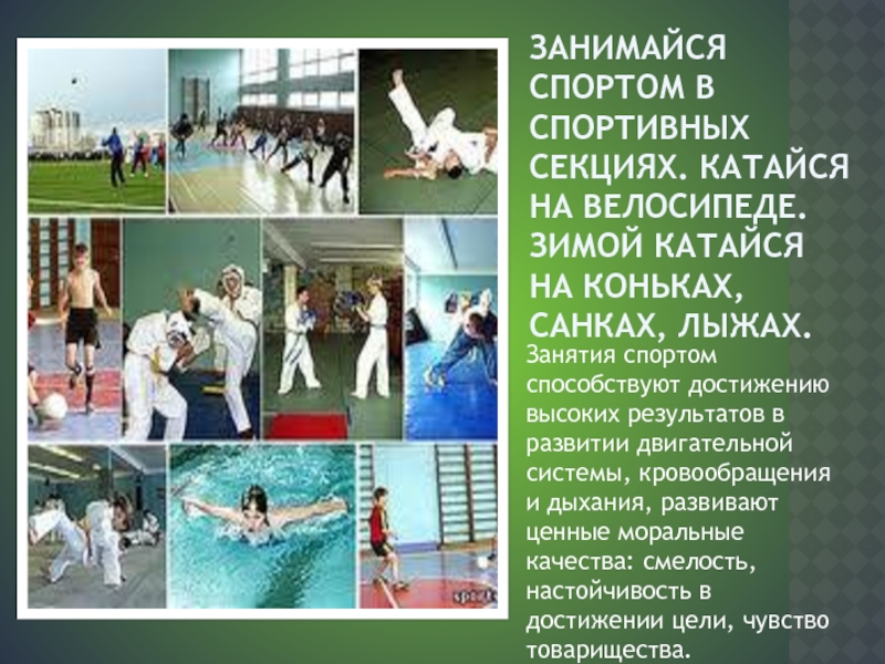 Слайд 7Занимайся спортом в спортивных секциях. катайся на велосипеде. зимой катайся