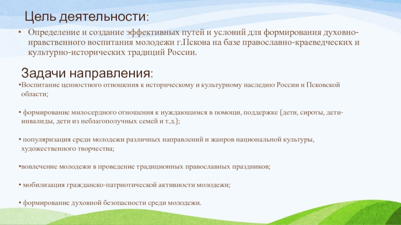 Воспитание ценностного отношения к историческому и культурному наследию России и Псковской области;