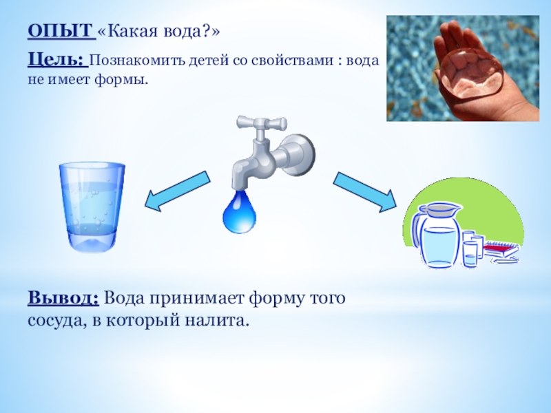 ОПЫТ «Какая вода?»Цель: Познакомить детей со свойствами : вода не имеет формы. Вывод: Вода принимает форму того