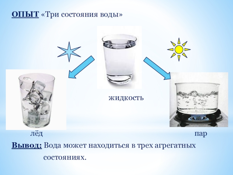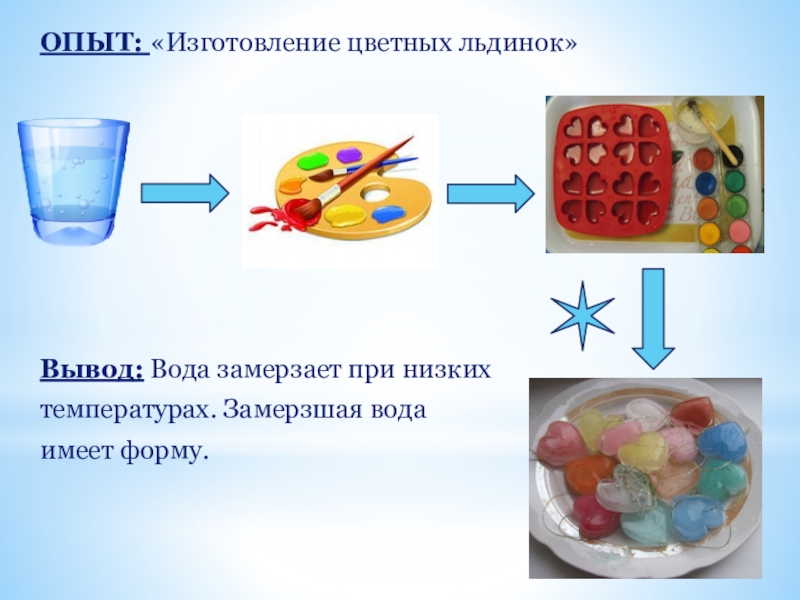 ОПЫТ: «Изготовление цветных льдинок»Вывод: Вода замерзает при низкихтемпературах. Замерзшая водаимеет форму.