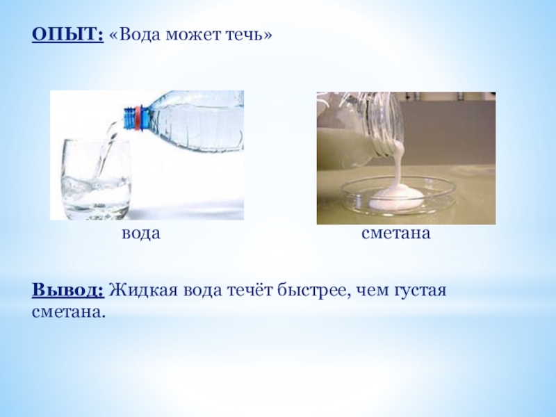 Вывод: Жидкая вода течёт быстрее, чем густая сметана.