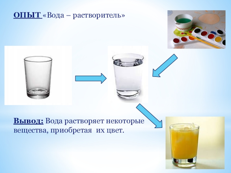 ОПЫТ «Вода – растворитель»Вывод: Вода растворяет некоторые вещества, приобретая их цвет.
