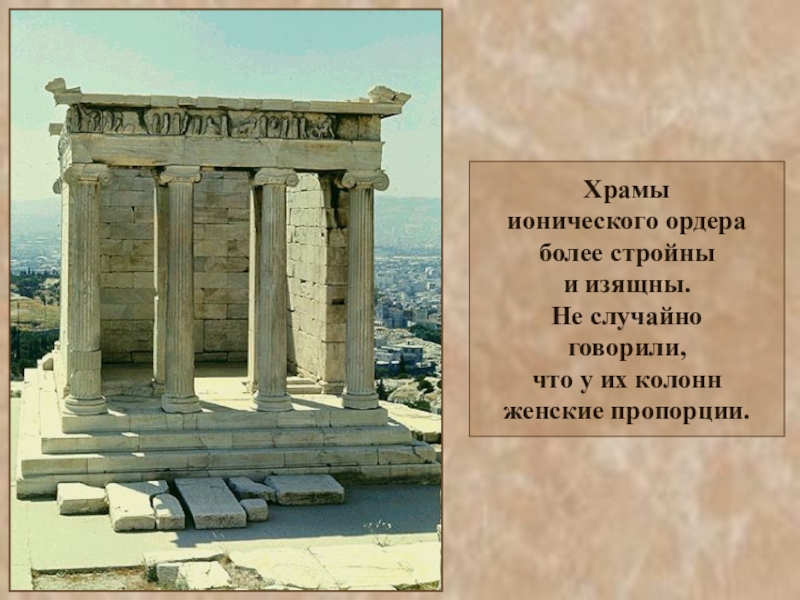 Храмыионического ордераболее стройныи изящны.Не случайноговорили,что у их колоннженские пропорции.