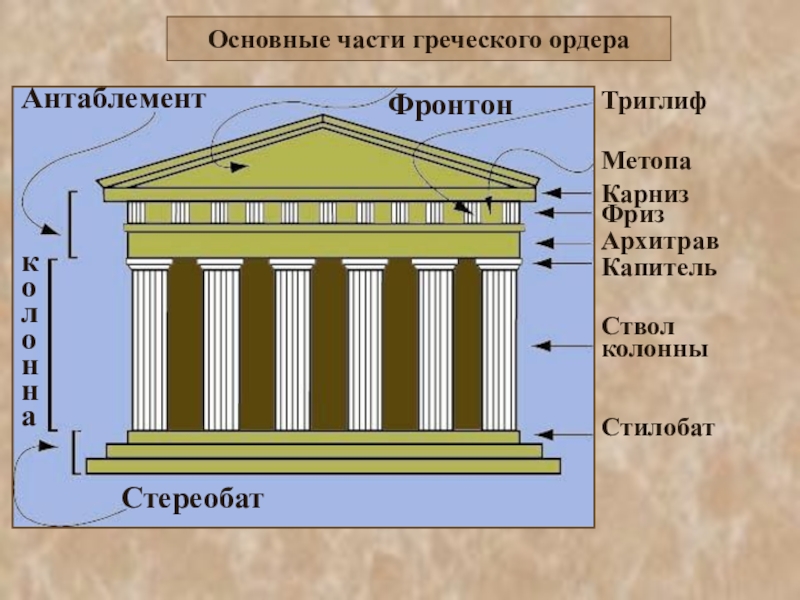 СтереобатколоннаАнтаблементФронтонСтилобатСтвол колонныКапительАрхитравФризКарнизМетопаТриглифОсновные части греческого ордера