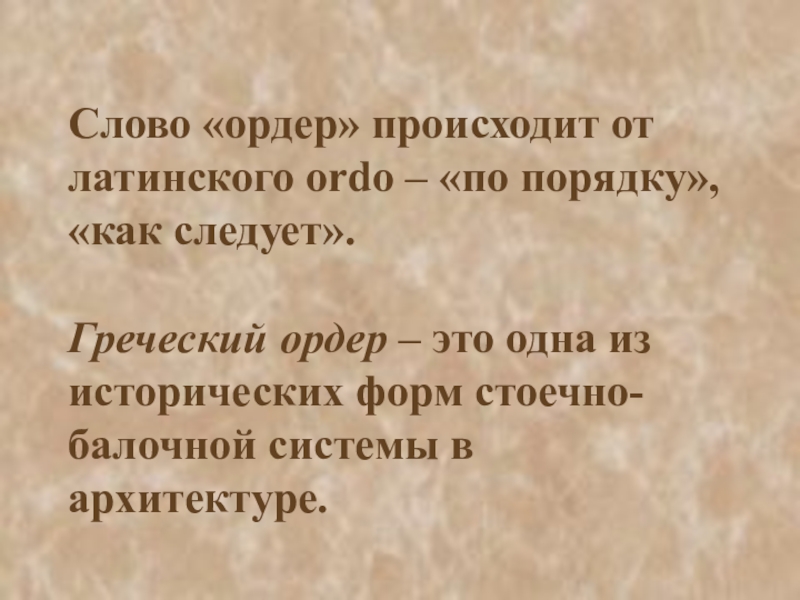 Слово «ордер» происходит от латинского ordo – «по порядку», «как следует».Греческий ордер – это одна из исторических форм стоечно-балочной системы в архитектуре.