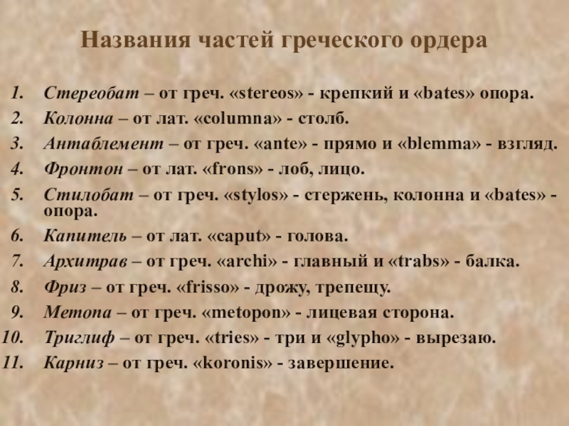 Названия частей греческого ордераСтереобат – от греч. «stereos» - крепкий и «bates» опора.Колонна – от лат. «columna»