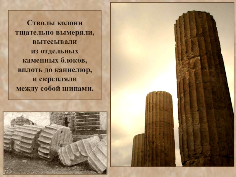 Стволы колоннтщательно вымеряли,вытесывалииз отдельныхкаменных блоков,вплоть до каннелюр,и скреплялимежду собой шипами.