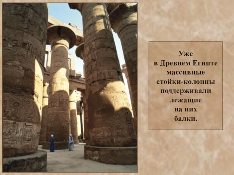 Ужев Древнем Египтемассивныестойки-колонныподдерживалилежащиена нихбалки.
