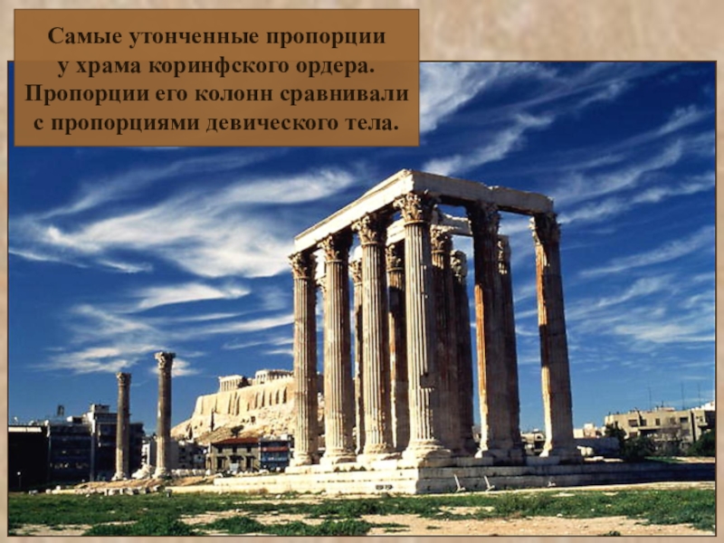 Самые утонченные пропорцииу храма коринфского ордера.Пропорции его колонн сравнивалис пропорциями девического тела.
