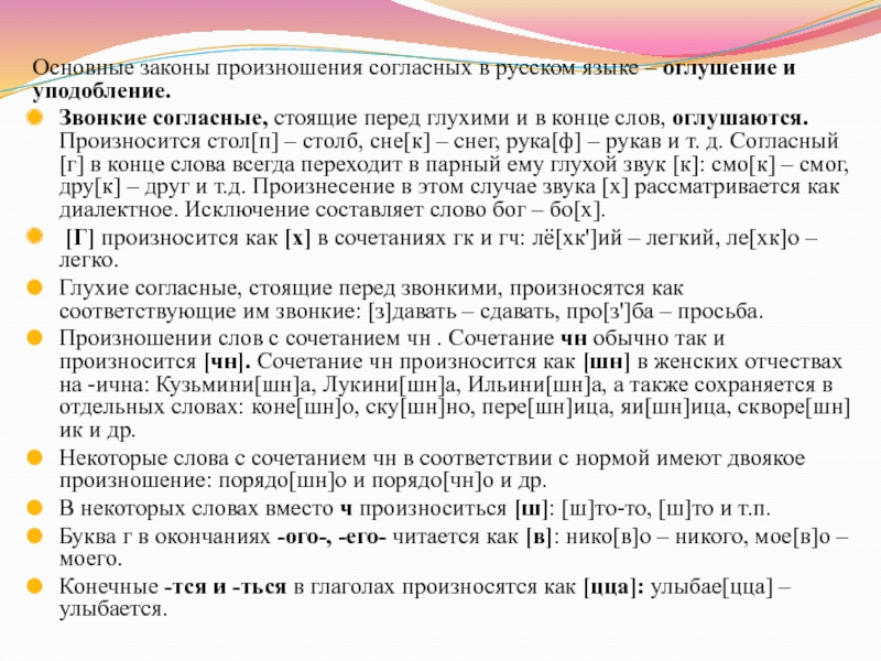 Слайд 9Основные законы произношения согласных в русском языке – оглушение и уподобление.