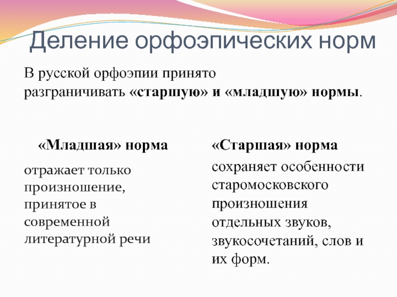 В русской орфоэпии принято разграничивать «старшую» и «младшую» нормы.