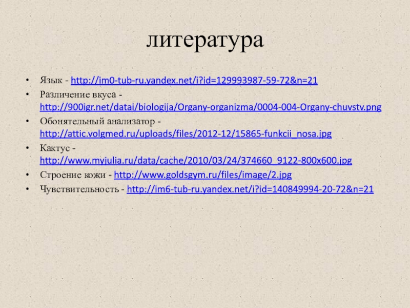 литератураЯзык - http://im0-tub-ru.yandex.net/i?id=129993987-59-72&n=21Различение вкуса - http://900igr.net/datai/biologija/Organy-organizma/0004-004-Organy-chuvstv.pngОбонятельный анализатор - http://attic.volgmed.ru/uploads/files/2012-12/15865-funkcii_nosa.jpgКактус - http://www.myjulia.ru/data/cache/2010/03/24/374660_9122-800x600.jpgСтроение кожи - http://www.goldsgym.ru/files/image/2.jpgЧувствительность - http://im6-tub-ru.yandex.net/i?id=140849994-20-72&n=21
