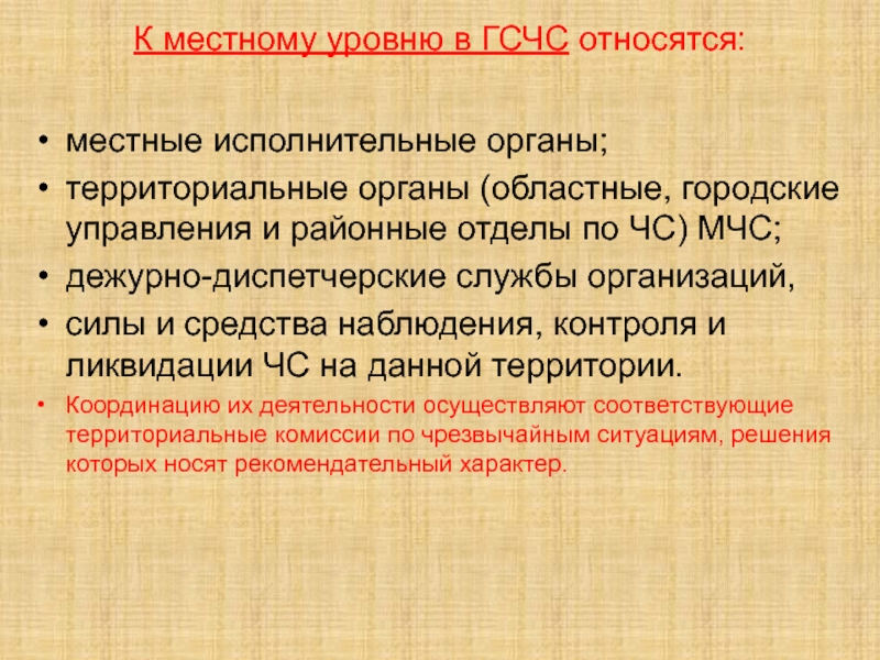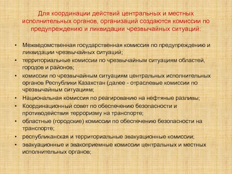 Координацию их деятельности осуществляют соответствующие территориальные комиссии по чрезвычайным ситуациям, решения которых носят рекомендательный характер.