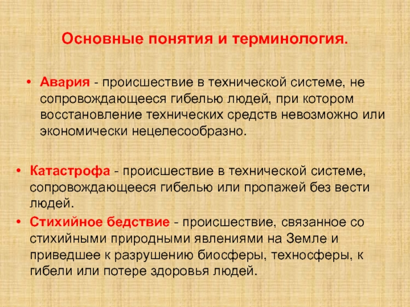 Катастрофа - происшествие в технической системе, сопровождающееся гибелью или пропажей без вести людей.