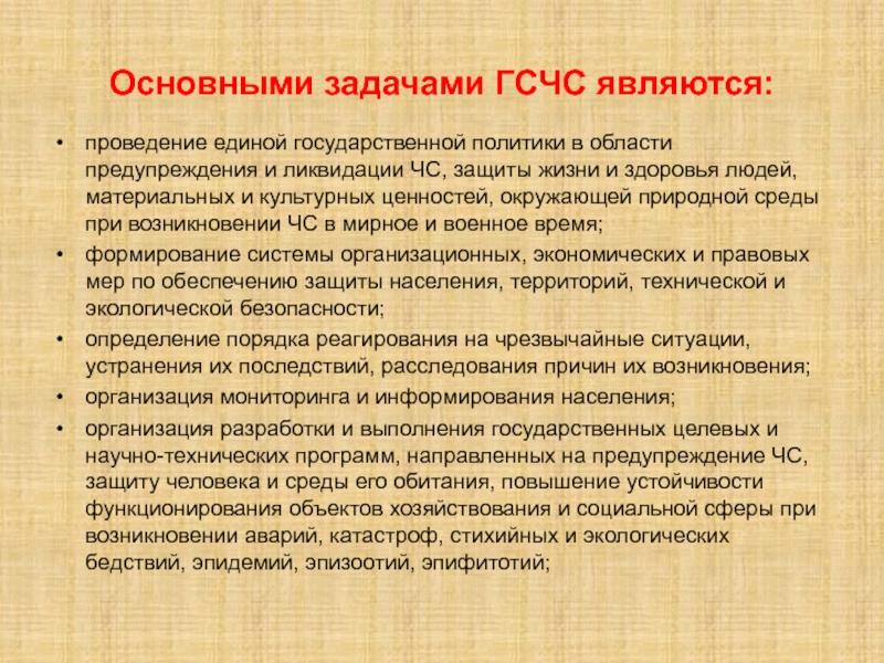 Государственная система предупреждения и ликвидации чрезвычайных ситуаций (ГСЧС) предназначена для предупреждения чрезвычайных ситуаций (ЧС) в мирное и военное время, а в случае их возникновения - для ликвидации их последствий, обеспечения безопасности населения, защиты окружающей природной среды и уменьшения ущерба объектам хозяйствования.