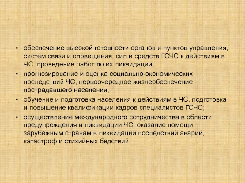 осуществление международного сотрудничества в области предупреждения и ликвидации ЧС, оказание помощи зарубежным странам в ликвидации последствий аварий, катастроф и стихийных бедствий.