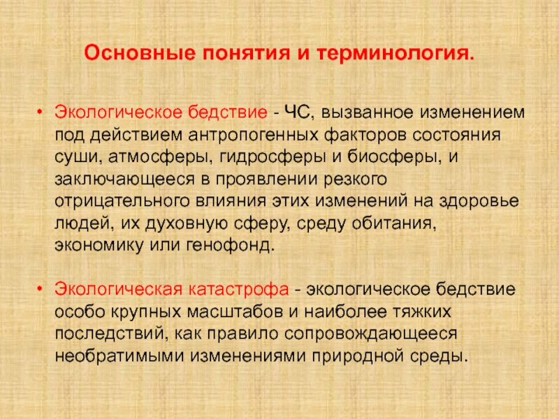 Экологическая катастрофа - экологическое бедствие особо крупных масштабов и наиболее тяжких последствий, как правило сопровождающееся необратимыми изменениями природной среды.