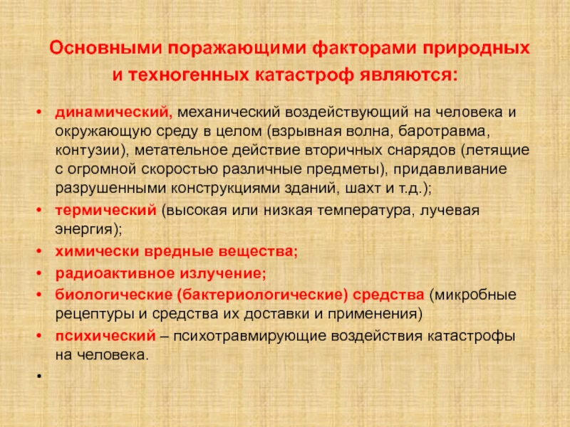 Слайд 18 Основными поражающими факторами природных и техногенных катастроф являются:
