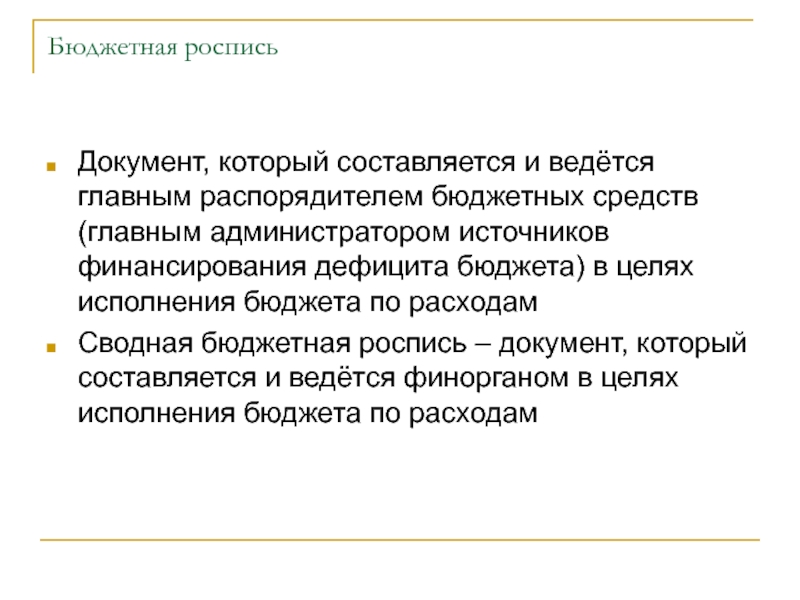 Бюджетная росписьДокумент, который составляется и ведётся главным распорядителем бюджетных средств(главным администратором источников финансирования дефицита бюджета) в целях