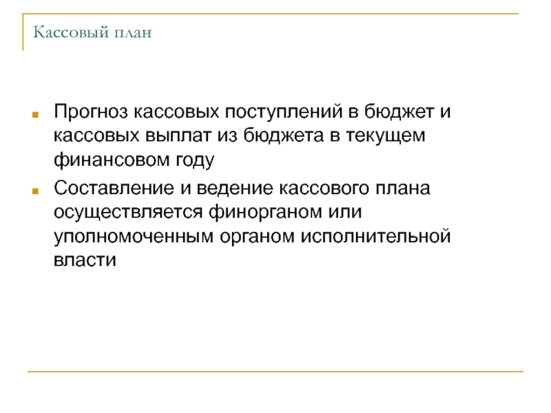 Кассовый планПрогноз кассовых поступлений в бюджет и кассовых выплат из бюджета в текущем финансовом годуСоставление и ведение