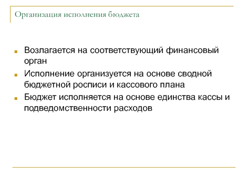 Организация исполнения бюджетаВозлагается на соответствующий финансовый органИсполнение организуется на основе сводной бюджетной росписи и кассового планаБюджет исполняется