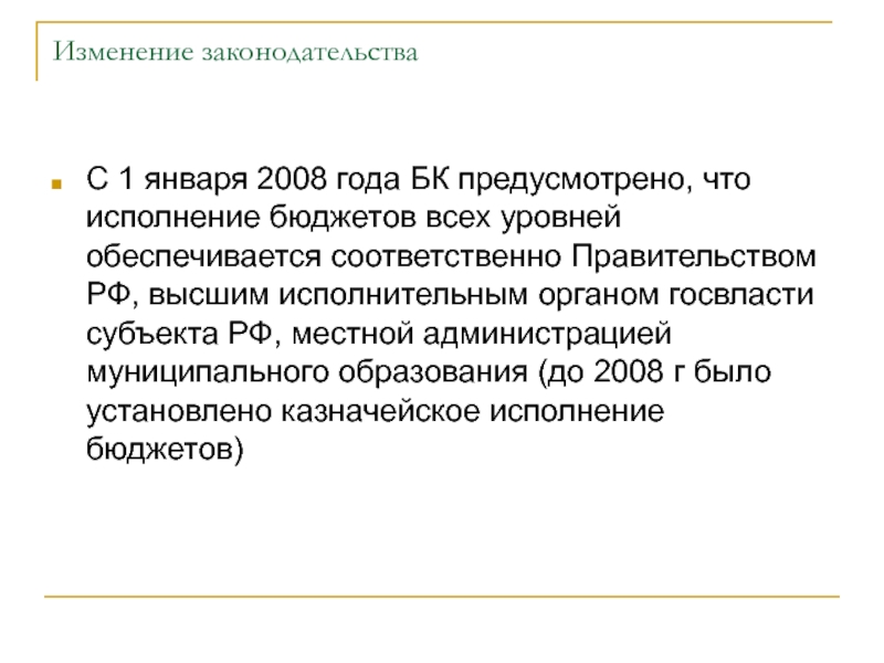 Изменение законодательстваС 1 января 2008 года БК предусмотрено, что исполнение бюджетов всех уровней обеспечивается соответственно Правительством РФ, высшим исполнительным органом госвласти субъекта РФ, местной администрацией муниципального образования (до 2008 г было