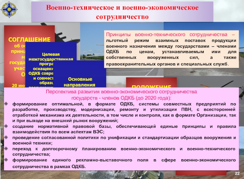 Принципы военно-технического сотрудничества – льготный режим взаимных поставок продукции военного назначения между государствами – членами ОДКБ по ценам, устанавливаемым ими для собственных вооруженных сил, а также правоохранительных органов и специальных служб.