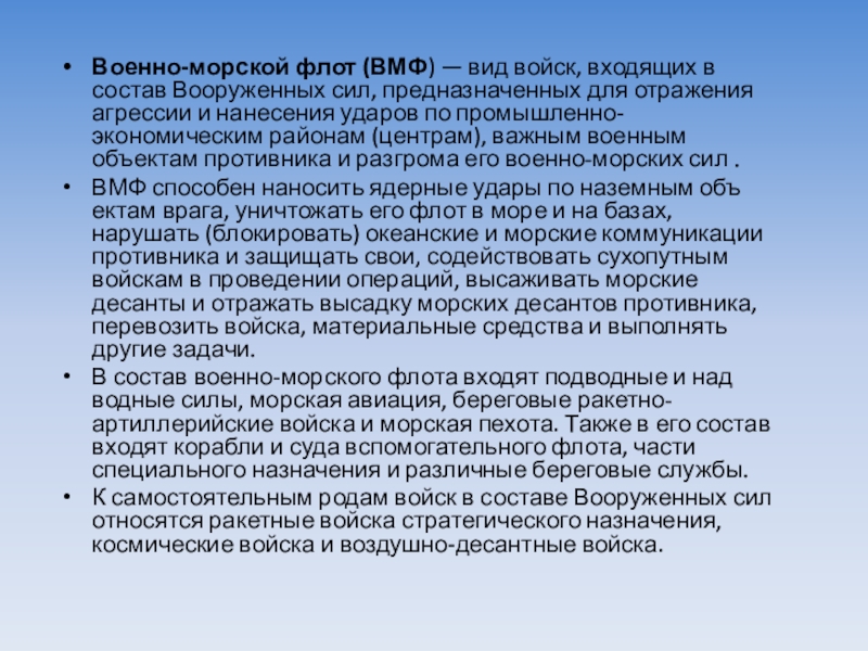 Слайд 6Военно-морской флот (ВМФ) — вид войск, входящих в состав Вооруженных