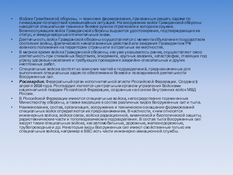 Слайд 11Войска Гражданской обороны, — воинские формирования, призванные решать задачи по ликвидации