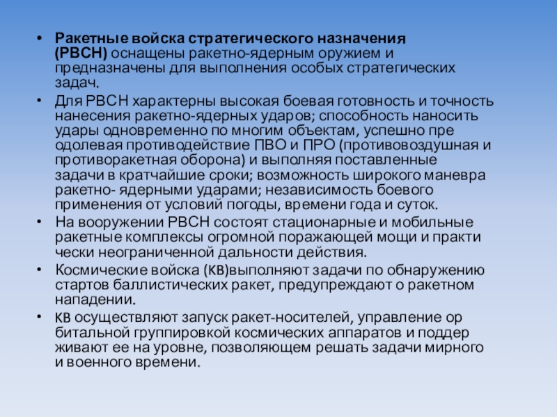 Слайд 7Ракетные войска стратегического назначения (РВСН) оснащены ракетно-ядерным оружием и предназначены для