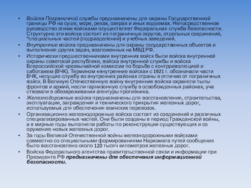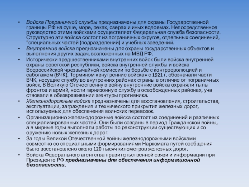 Слайд 10Войска Пограничной службы предназначены для охраны Государственной границы РФ на суше,