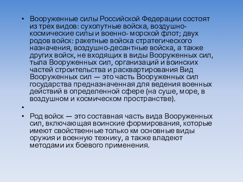 Слайд 2Вооруженные силы Российской Федерации состоят из трех видов: сухопутные войска,