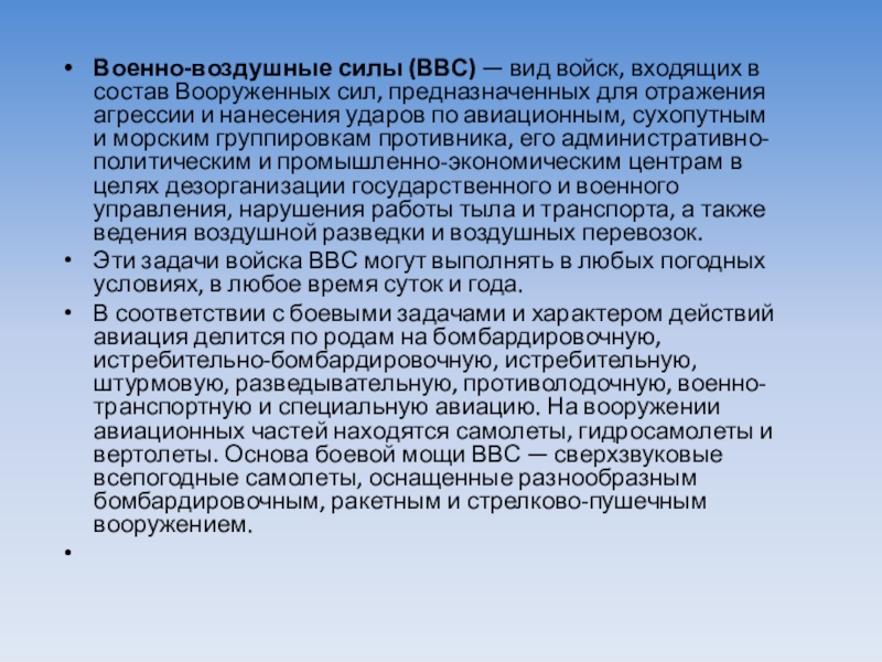 Слайд 5Военно-воздушные силы (ВВС) — вид войск, входящих в состав Вооруженных сил,