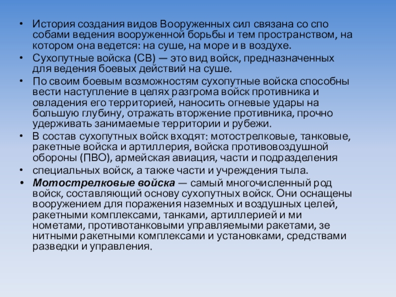 Слайд 3История создания видов Вооруженных сил связана со способами ведения вооруженной