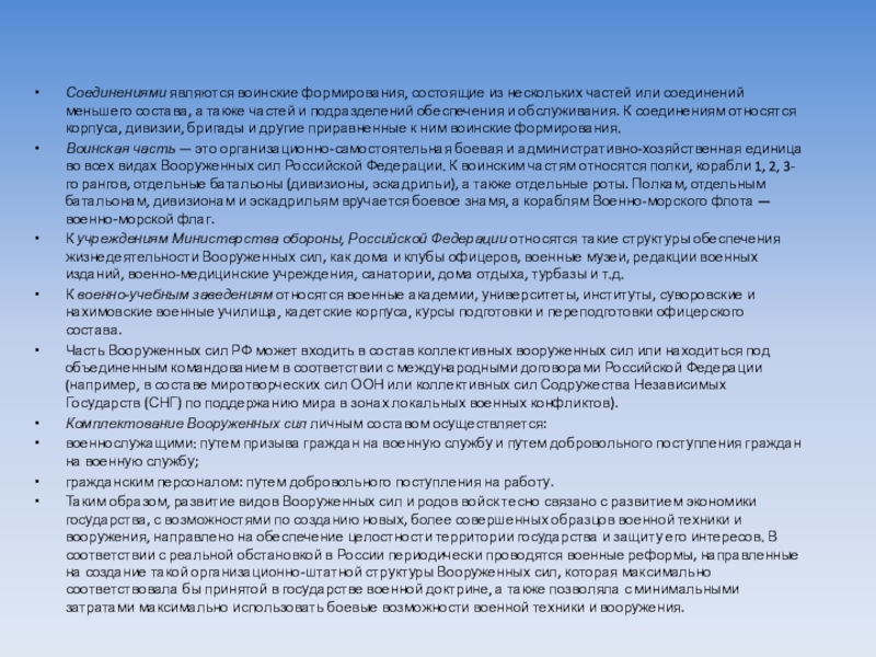 Вооруженные силы Российской Федерации состоят из органов управления, объединений, соединений, воинских частей, учреждений, а также военно-учебных заведений.