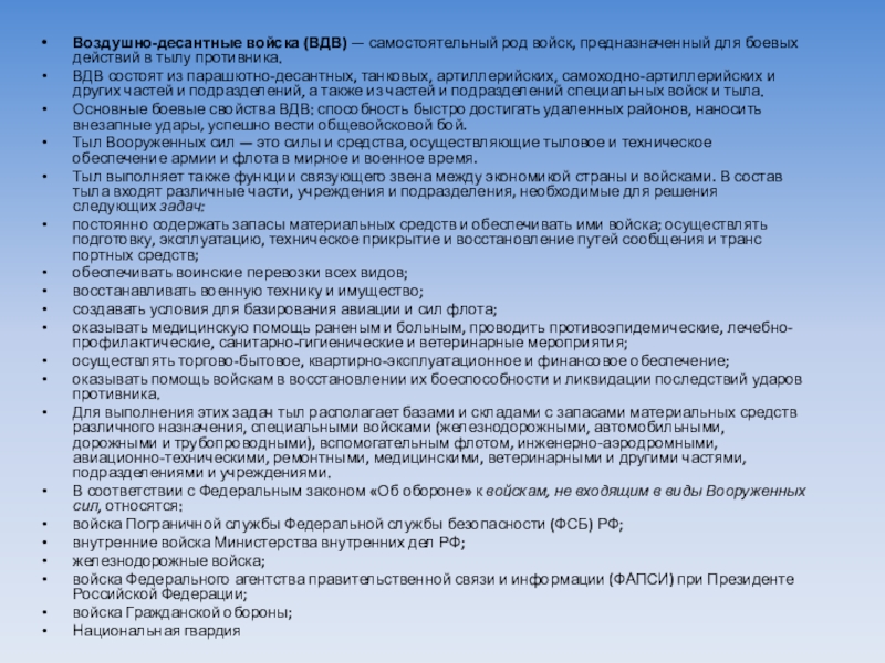 Слайд 8Воздушно-десантные войска (ВДВ) — самостоятельный род войск, предназначенный для боевых действий