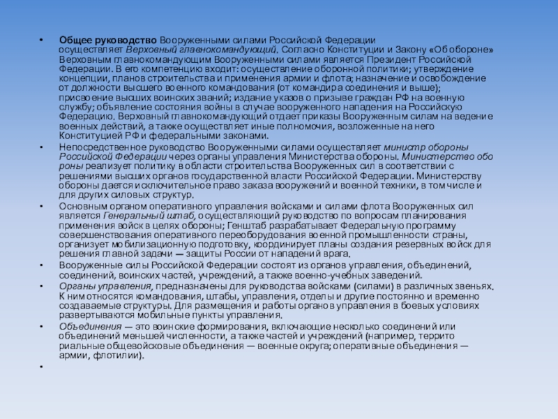 Слайд 12Общее руководство Вооруженными силами Российской Федерации осуществляет Верховный главнокомандующий. Согласно Конституции и Закону