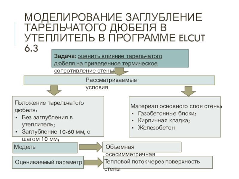 Слайд 13Моделирование Заглубление тарельчатого дюбеля в утеплитель в программе elcut 6.3