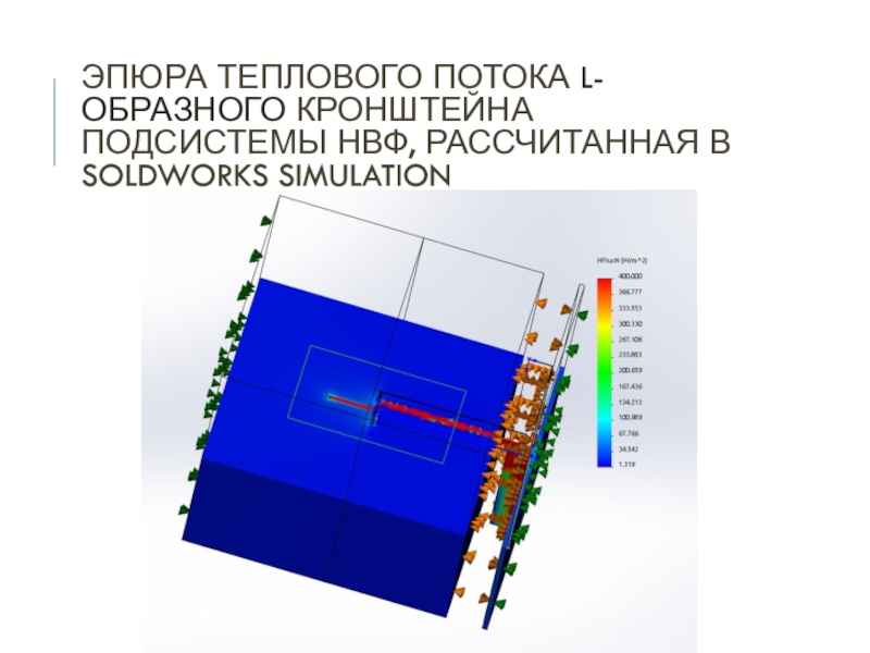 Слайд 27Эпюра теплового потока L-образного кронштейна подсистемы НВФ, рассчитанная в soldworks