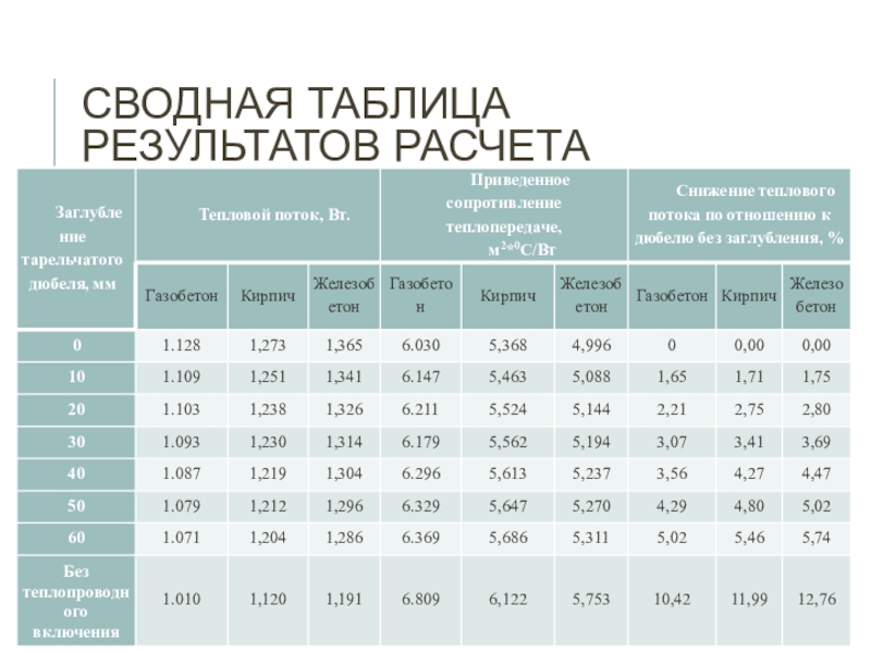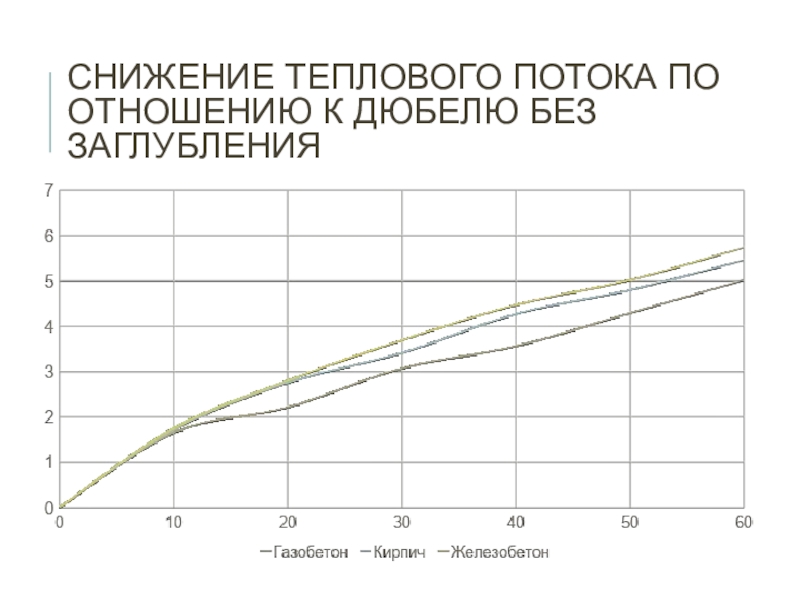 Слайд 21Снижение теплового потока по отношению к дюбелю без заглубления