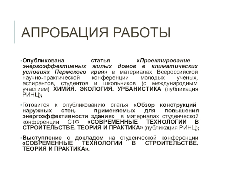 Готовится к опубликованию статья «Обзор конструкций наружных стен, применяемых для повышения энергоэффективности здания» в материалах студенческой конференции СТФ «СОВРЕМЕННЫЕ ТЕХНОЛОГИИ В СТРОИТЕЛЬСТВЕ. ТЕОРИЯ И ПРАКТИКА» (публикация РИНЦ);